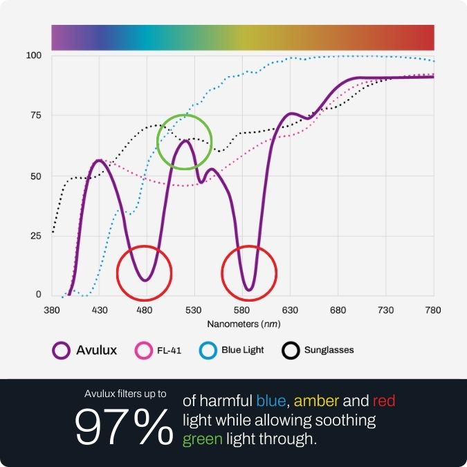 That’s why Avulux engineers developed a lens that precisely filters up to 97% of the most harmful blue, amber and red light while allowing in up to 70% of soothing green light.